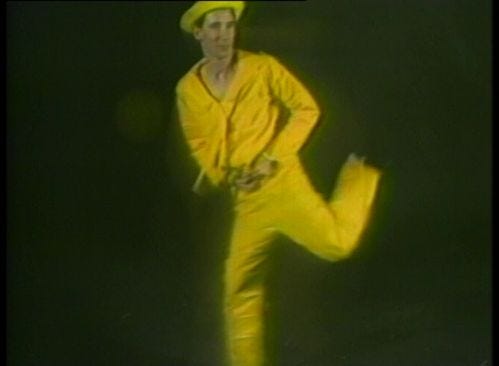The Banana Man (1983) is Mike Kelley’s first recorded performance work. Never having seen the show Captain Kangaroo, but having heard other kids talk about the show’s banana man, Kelley interpolated his own version of the character from the fragments gleamed; namely that the banana man liked to pull long items from his many pockets, including toy trains and strings of hot dogs, and also his vocalisation of an oooh sound that accompanied this sort of activity. It the strikingly odd performance — which for me spoke to the surreal, audibly repetitive lo-fi films of Cecilia Condit, particularly Possibly in Michigan of the same year — Kelley as banana man repeatedly insists that he is not responsible for his actions, acts as mother to a colony of squeaky dog toys, and states that he doesn’t need the front two legs of a chair as he has his own two legs. The strangeness of the script is perhaps what I liked so much about The Banana Man, though in that strangeness is the same old question of identity, responsibility and external influence. The Banana Man auspiciously ends with Kelley, in his yellow banana suit, curled up on the floor in the shape of a question mark.